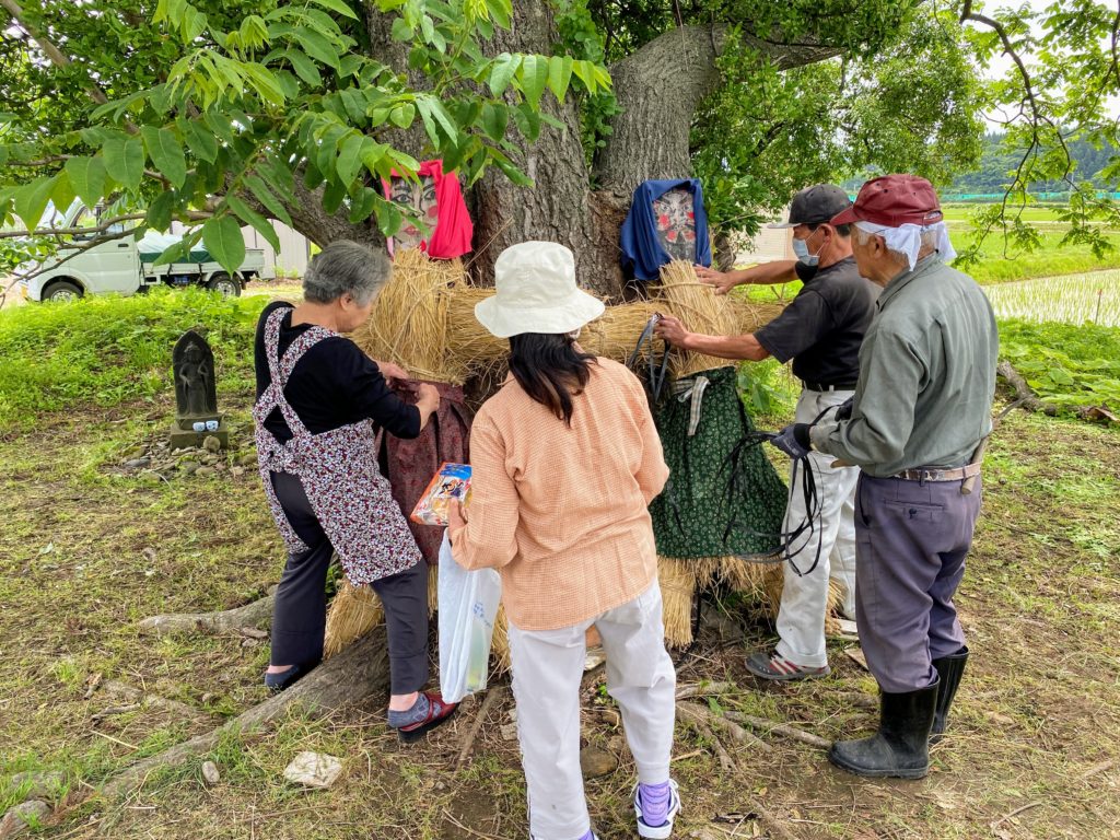 ショウキサマの衣替えは午前10時半にはほぼ完成。2体に頬かむりと前掛けをまとわせ、胡桃の木の下に安置します。それぞれのお顔は平成29年に頭と骨組みを新調した際に山谷多鶴子さんのご主人が描かれたそう。美魔女っぽい女神のモデルは奥様のようです。