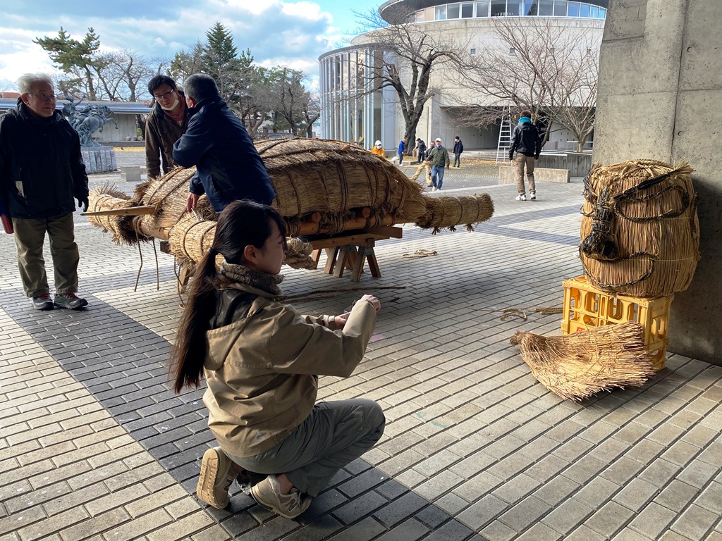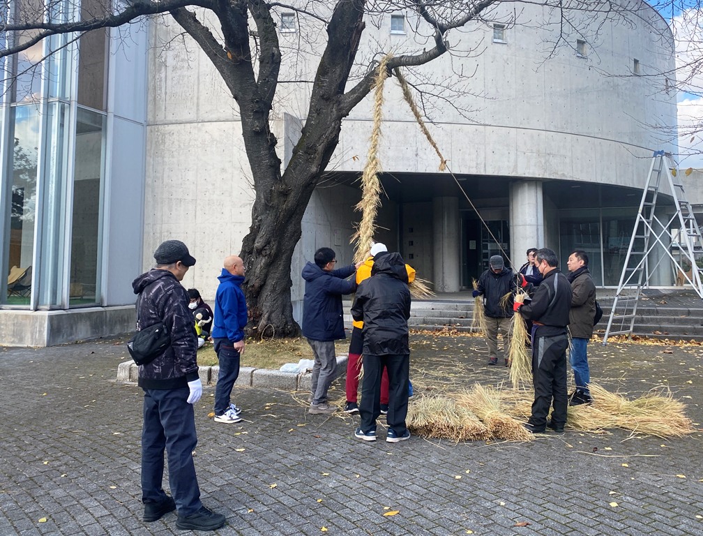 11月22日、午前10時に美大本棟(アトリウム棟)に集合し、開会宣言とともに作業がスタート!参加者は屋内チームと屋外チームに分かれて活動しました。末野集落からは、斉藤繁さんをはじめとする6名の方々が指導のために参加してくださいました。屋外チームでは、繁さんが音頭を取り、まずショウキサマを横たえて丁寧に解体。そのあとは、いよいよ新しい注連縄(しめなわ)作りです!図書館前の桜の木の枝を使い、5、6人がかりで太く立派な注連縄を編み上げていきました。伝統的な作業の力強さに、参加者からも「こんな風に作っていたのか」という驚きの声が上がっていました。