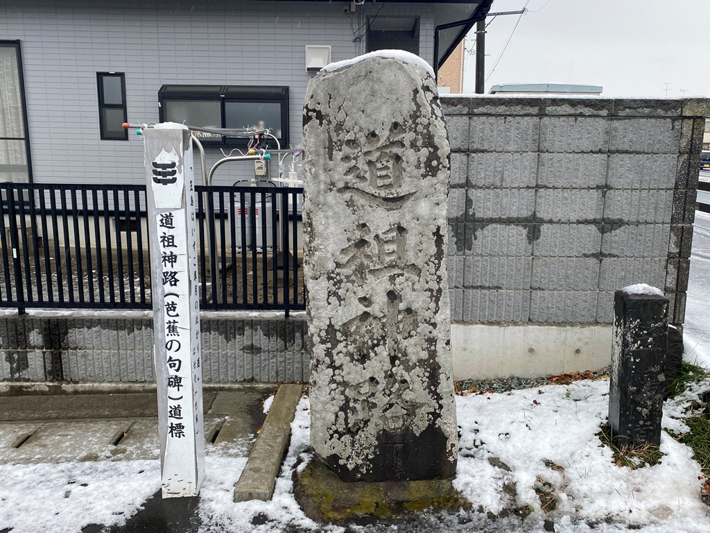 次の目的地である名取市歴史民俗資料館へ向かう道中、多賀糸さんが「今、道端に『道祖神』と彫られた石碑がありました!」と言われたので、急ぎ車を引き返しました。そこにあったのは、「道祖神路」の文字が刻まれた道標です。安政3年(1856年)に建立されたもので、神野先生によれば、この近くに「道祖神社」が鎮座しているとのこと。これこそ「道祖神の招きに違いない」と、私たちはその神社を訪ねてみることにしました。