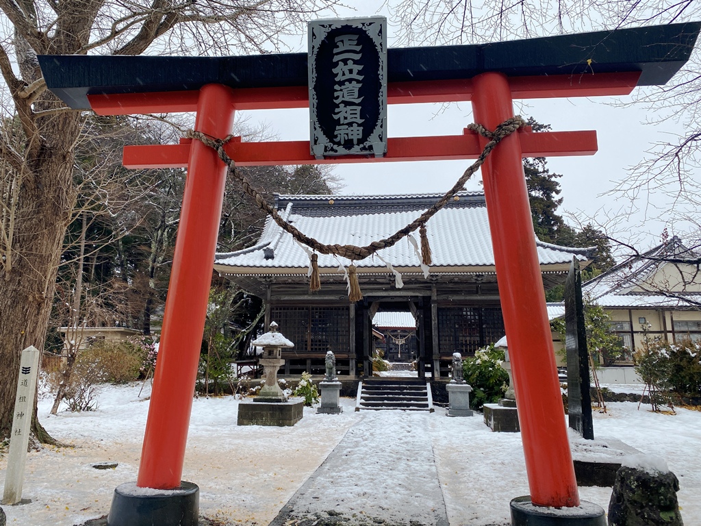 「道祖神路」の道標から車で5分ほど。小高い山の中腹に「道祖神社」が鎮座していました。道祖神を祀る社といえば、こぢんまりとした祠のような佇まいを想像していましたが、眼前に現れたのはそれとは正反対の、立派で風格のある構え。その堂々たる姿に驚きを隠せませんでした。祭神は猿田彦(サルタヒコ)と天鈿女命(アメノウズメ)。鳥居に掲げられた扁額には「正一位道祖神」の文字が刻まれていました。これほどまでに高い神格を誇る道祖神に参拝するのは初めてです。