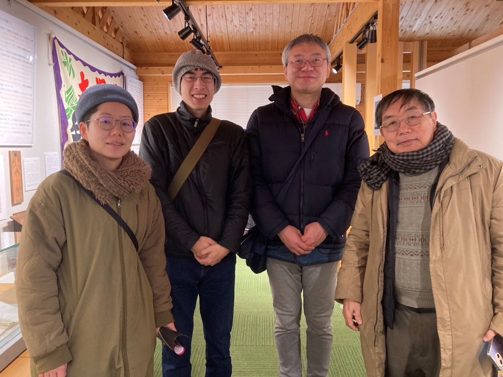 続いて訪ねた名取市歴史民俗資料館では、「自治体史と暮らしの記憶」というテーマのもと、宮本常一先生も関わられた「川崎町史」の編纂に関する貴重な資料が展示されていました。ここで、同行した4人で記念撮影。