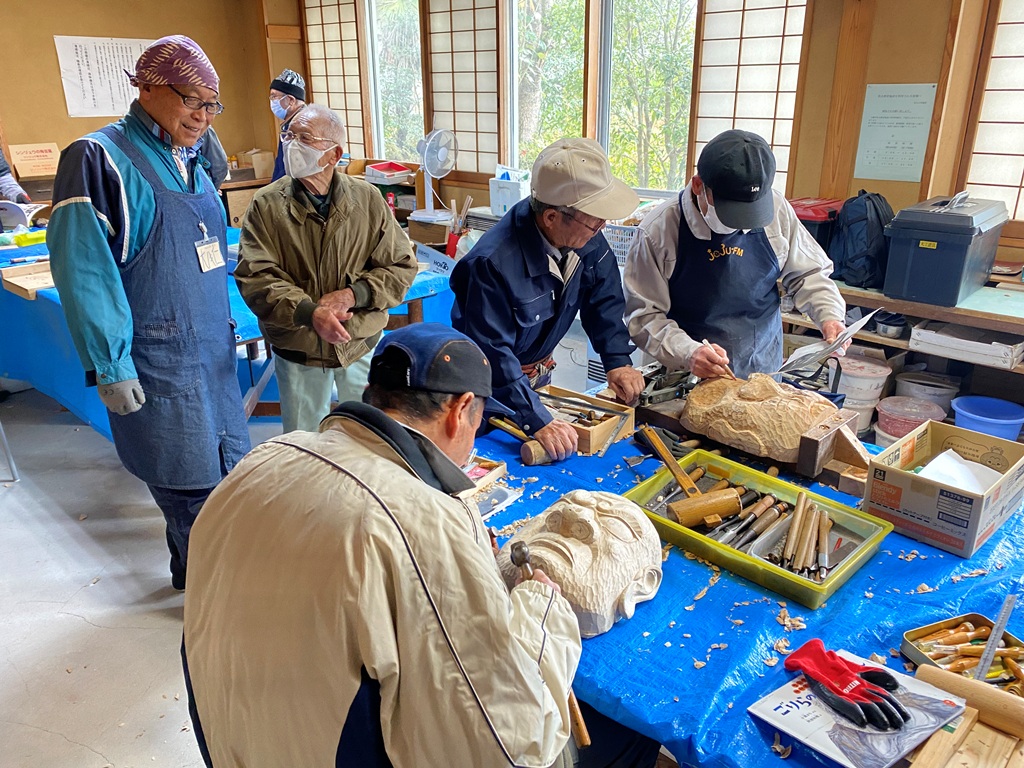 「ふるさと館」に隣接する「老人福祉センター」では、彫刻家・千葉照男さんによるカマガミ制作ワークショップ「伊達(いき)な木彫り塾」が開催されていました。大崎市出身の千葉さんは、自身の制作活動のかたわら、長年カマガミの制作と普及に尽力されています。参加者の中には、今回で13作目という常連の方もいらっしゃいました。「民俗文化の継承」という観点からも、このワークショップは非常に意義深い取り組みだと思いました。