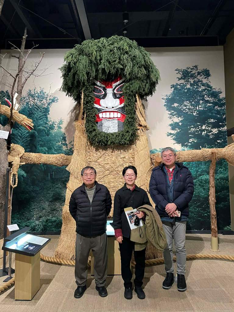 企画展にかなりの時間を割いたため、常設展を回る時間はなくなってしまいましたが、神野先生が監修に関わられた「村におけるワラの神々」のコーナーだけは拝見しました。ここは、東北各地の人形道祖神や人形送り行事の藁人形、そして来訪神などが一堂に会する圧巻の展示室です『村を守る不思議な神様・永久保存版』(KADOKAWA)に登場する藤巻のヤクジンサマや石名坂のアマノハギをはじめ、秋田県の資料も数多く展示されており、2年前に初めて訪れた際、「これほどの展示が秋田にあれば……」と悔しい思いをしたことを鮮明に覚えています。今年4月に取材した福島県田村市の「オニンギョウサマ」のレプリカを背景に、神野先生親子と一緒に記念写真を撮影しました。