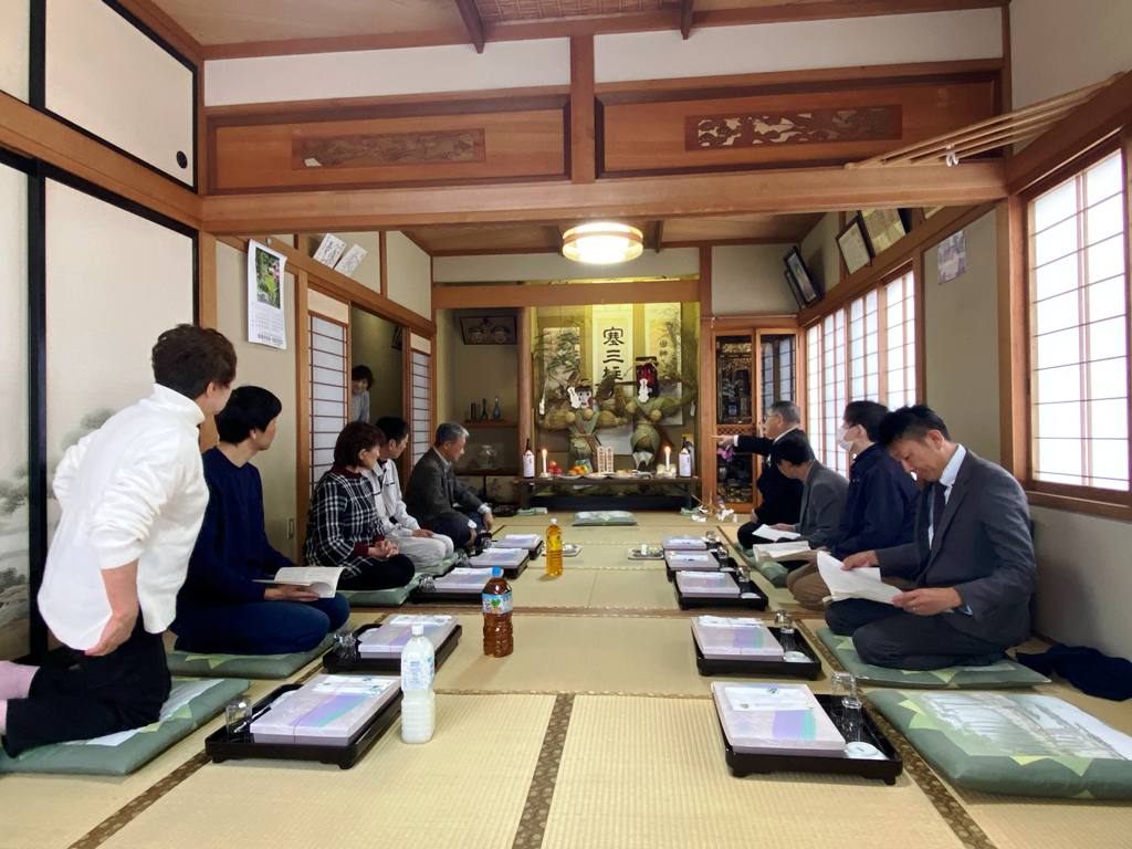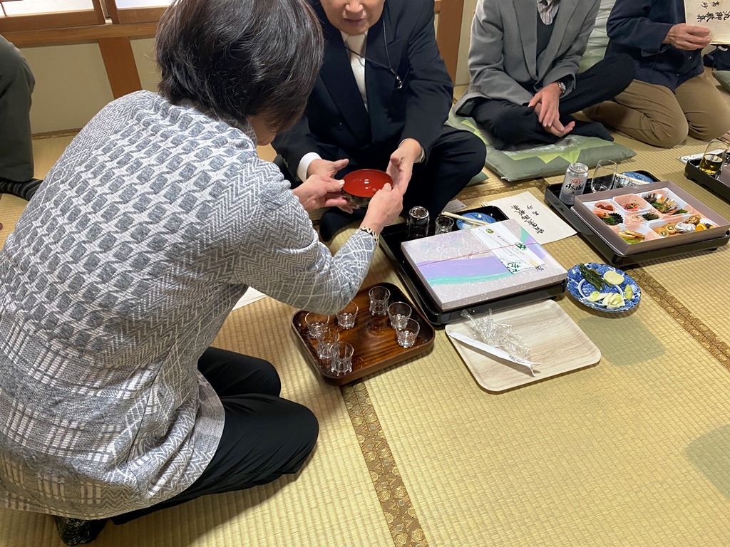 宴もたけなわとなった頃、宿を今年から来年の当番へと引き継ぐ「トワタシ(戸渡し)」が行われます。これは三々九度の形式で執り行われる厳かな儀式です。初めて取材した2018年には、翌年の宿となる家の奥様が仕事でどうしても参加できず、宮原さんが代役を務められたことも、今では懐かしい思い出です。