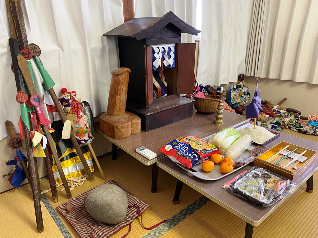 一時間ほどの勧進を終え、一行は集会所へと戻りました。 川端の塞の神は、五月人形の「鍾馗様」によく似た容貌をしていますが、町内の方々は「猿田彦」の名で呼んでいます。その周囲には男根を象った木彫りや石棒などが共に祀られており、まさに塞の神の祭壇らしい佇まいを見せています。