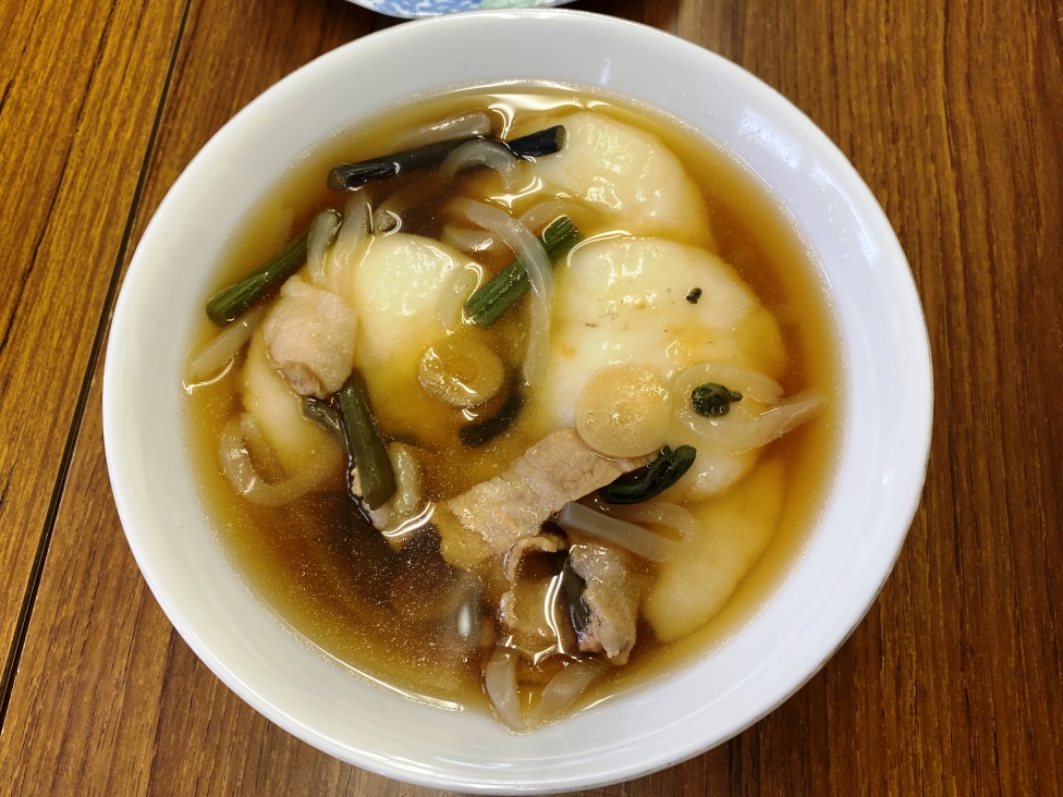 勧進を終えた集会所では、直会が行われました。そこで振る舞われたのはお雑煮です。かつては家々から奉納された餅を集めて煮ていたそうですが、現在はあらかじめ用意したものを用います。まさに塞の神の行事食であり、町内を歩いて冷え切った体が芯から温まりました。