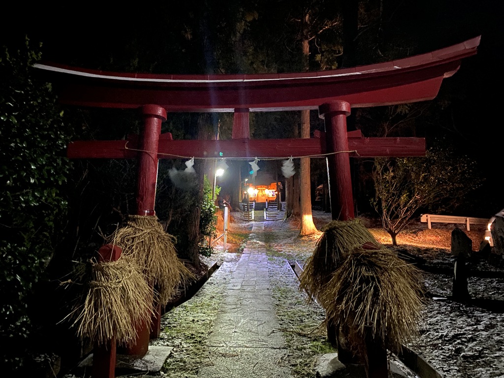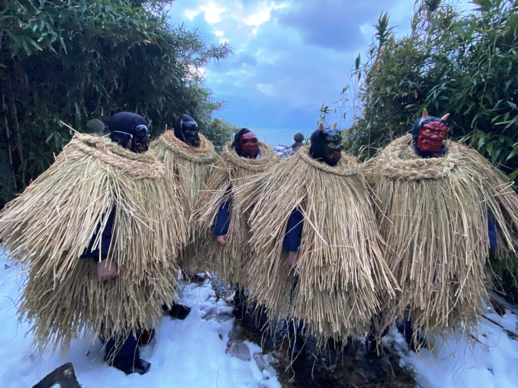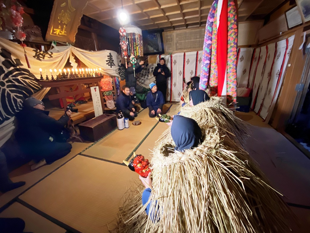 1時間半ほどかけて集落の各家々を巡った後、ナマハゲたちは村の神社へと戻りました。そこで身に纏っていたケラを脱ぎ、神社の鳥居に巻き付けます。このケラは、4月に行われる神社の例大祭までそのままにしておくとのこと。一年の取材を締めくくるに相応しい、人形立て行事と来訪神行事のイメージが交錯する象徴的な瞬間でした。