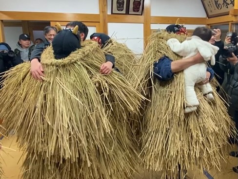 お宅に上がると、アマハゲは奇声を上げながら、一直線に子どもたちのもとへ突入します。恐怖に身をすくめる子どもを抱きかかえ、独特の裏声で「イイコニスルカ?」などと戒めます。泣き叫ぶ子どもの声と、アマハゲの鋭い奇声が家中に響く様は、男鹿のナマハゲとはまた異なる、女鹿ならではの怪しくも神聖な雰囲気に包まれます。