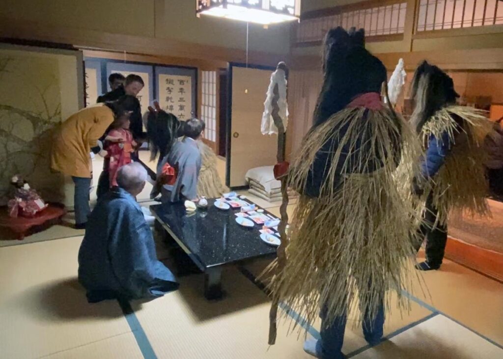 神社での参拝後、6匹のナマハゲは「オヤゲ」と敬称される大渕家へ。男鹿地方で有力者の家を指すこの言葉は、鵜木では代々肝煎を務めてきた大渕家を指してきました。家主の温かなもてなしを受けた一行は、その後3匹ずつ上・下の二手に分かれ、夜の集落へと繰り出しました。