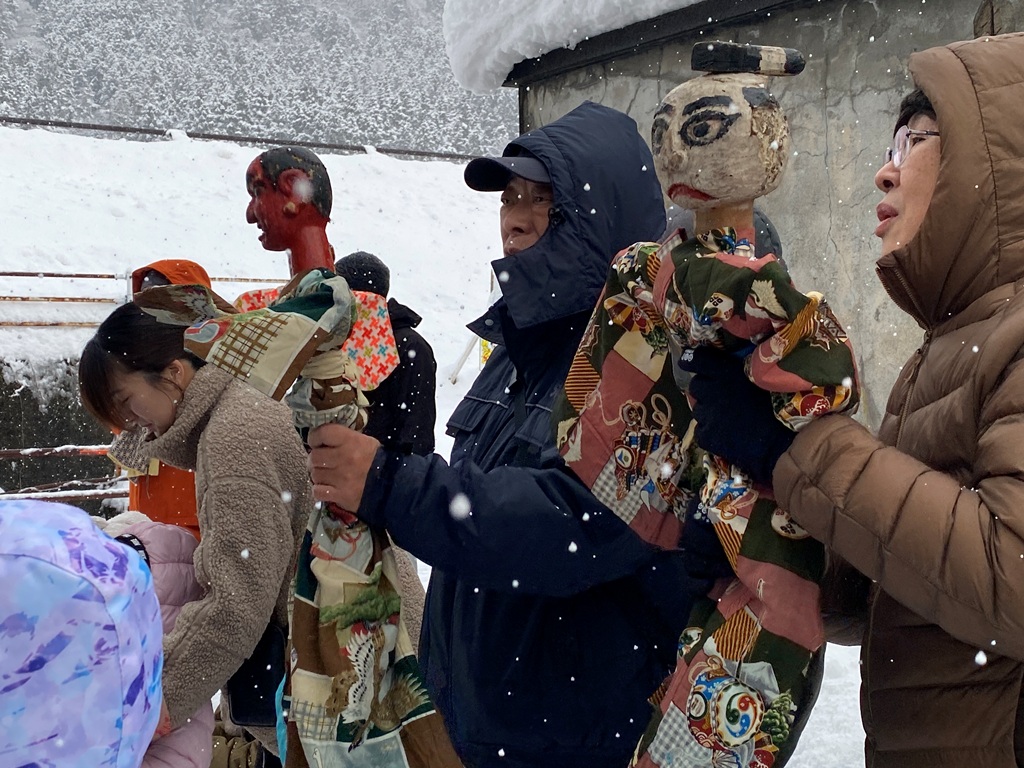 町内の家々を一巡した後は、清川の中心に鎮座する道祖神の「石祠(いしぼこら)」へと向かいます。ここでは「朝鳥追(あさとりおい)の唄」に合わせ、再び人形を振ります。現在、勧進は休止していても、この場所へデクサマを持参して唄を奉納する形式を続けている町内もあるようです。
