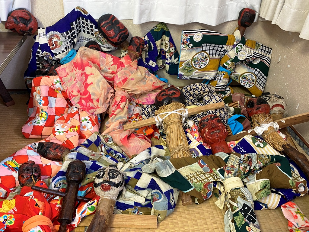 川端の「デクサマ」は計13体。本体は頭部と十字型の骨組みで構成されており、そこに藁などで肉付けをしたあと、子ども用の衣装を着せます。この着せ替え作業は、行事の前日に行われるそうです。顔の表情は、人形芝居を思わせる写実的なものから、木の瘤の形状を活かした「ウメボシ」と呼ばれる独特の造形まで多岐にわたります。全体として、赤い顔をした個体が目立つのも特徴的です。