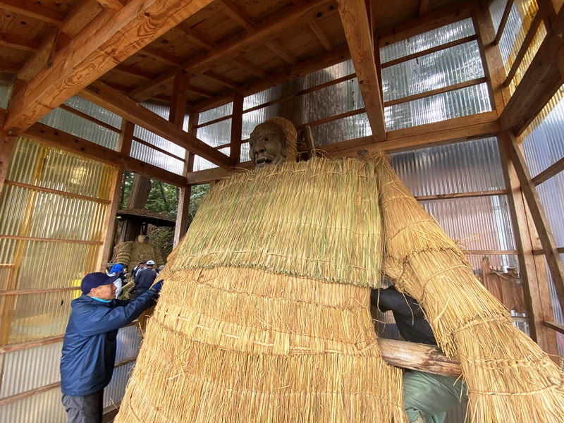 大館市松峰の稲荷神社(松峰神社里宮)には源義経、武蔵坊弁慶、那須与一という武将の名前が付けられたユニークな人形道祖神(人形様)が祀られています。11月24日は人形様のお祭り。午前中に人形の衣替えをし、夕方から若者が背負って集落を練り歩きます。集落の辻々で住民の皆さんが串に刺したきりたんぽやみかんを人形に刺して奉納。その上に蝋燭を付けて三体の人形様の顔を照らし出す様子はまるで映画『八つ墓村』のようで、「こんな個性豊かな信仰が秋田県にあったのか」と感動しました。